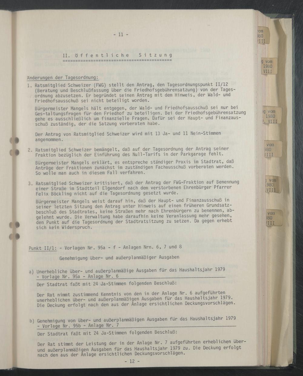 Der Rat stimmt der Leistung der in der Anlage Nr. 7 aufgeführten erheblichen überund außerplanmäßigen Ausgaben für das Haushaltsjahr 1979 zu. Die Deckung erfolgt nach den aus der Anlage ersichtlichen Deckungsvorschlägen.