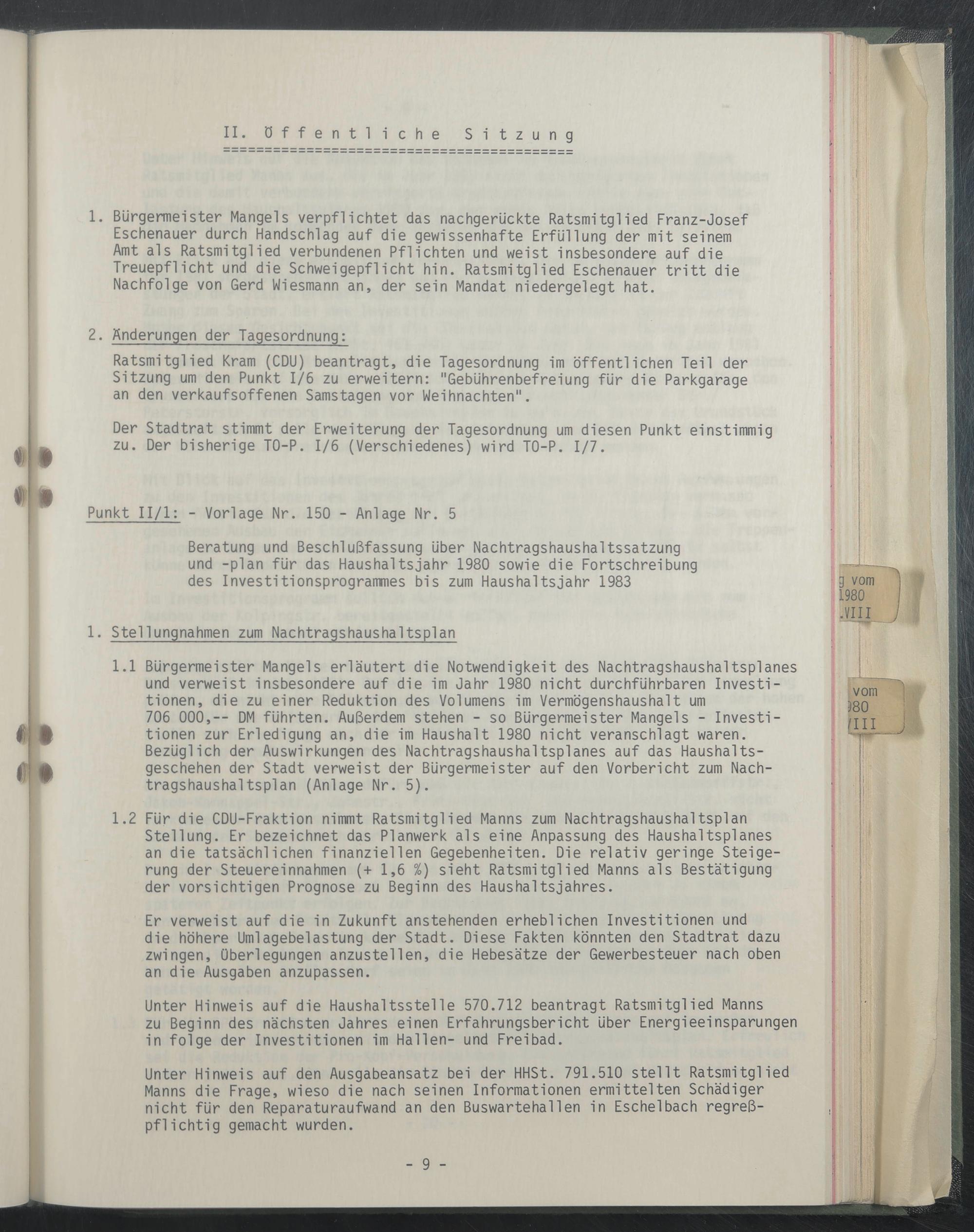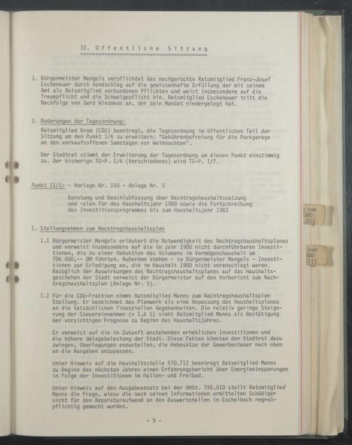 1.1 Bürgermeister Mangels erläutert die Notwendigkeit des Nachtragshaushaltsplanes und verweist Insbesondere auf die Im Jahr 1980 nicht durchführbaren Investitionen, die zu einer Reduktion des Volumens Im Vermögenshaushalt um 706 000,-- DM führten. Außerdem stehen - so Bürgermeister Mangels - Investitionen zur Erledigung an, die Im Haushalt 1980 nicht veranschlagt waren. Bezüglich der Auswirkungen des Nachtragshaushaltsplanes auf das Haushaltsgeschehen der Stadt verweist der Bürgermeister auf den Vorbericht zum Nachtragshaushaltsplan (Anlage Nr. 5).