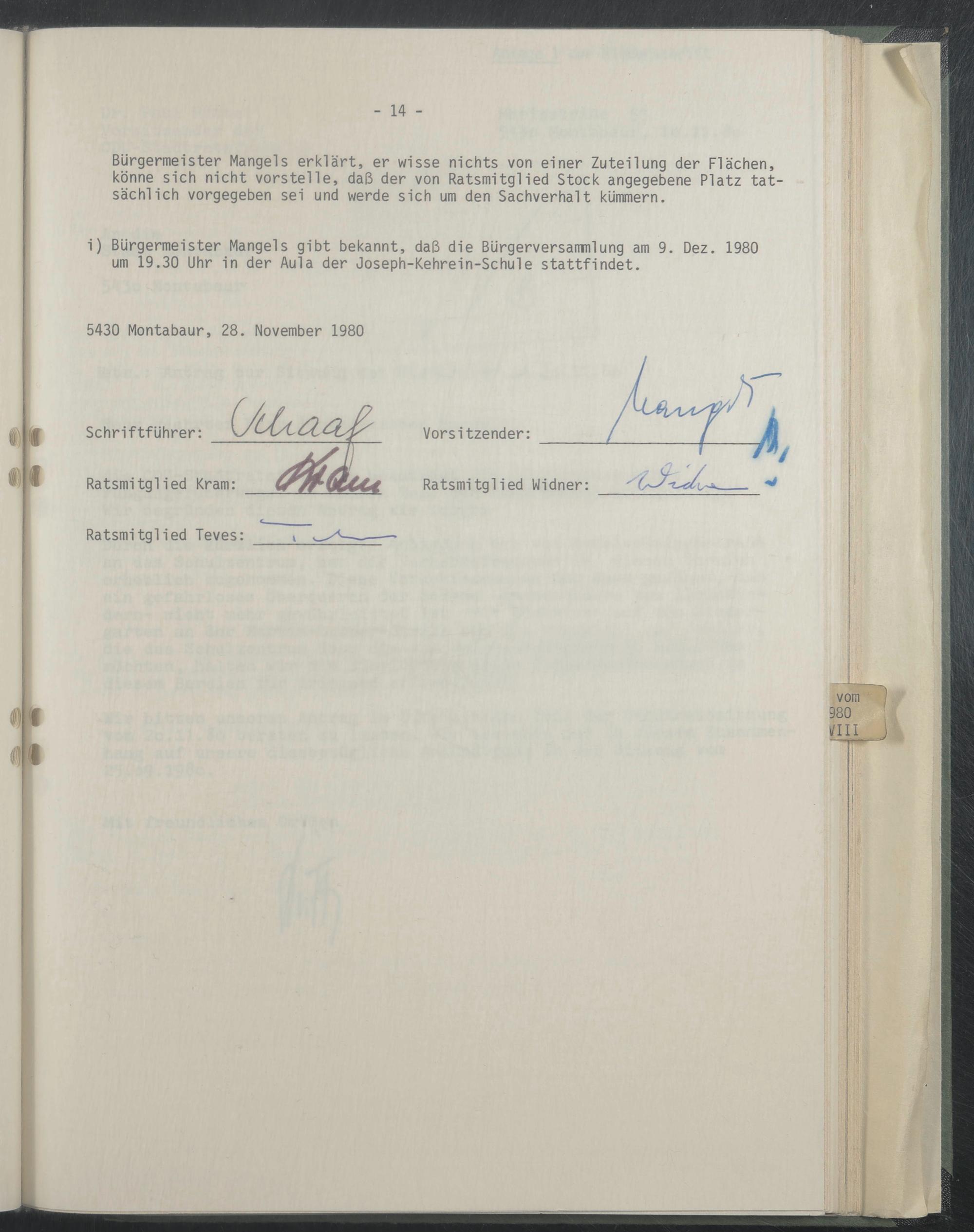 i) Bürgermeister Mangels gibt bekannt, daß die Bürgerversammlung am 9. Dez. 1980 um 19.30 Uhr in der Aula der Joseph-Kehrein-Schule stattfindet.