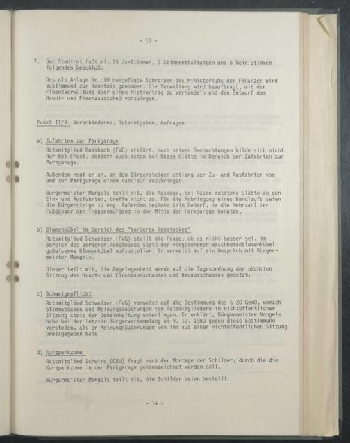 Ratsmitglied Schweizer (FWG) verweist auf die Bestimmung des § 20 GemO, wonach Stimmabgaben und Meinungsäußerungen von Ratsmitgliedern in nichtöffentlicher Sitzung stets der Geheimhaltung unterliegen. Er erklärt, Bürgermeister Mangels habe bei der letzten Bürgerversammlung am 9. 12. 1980 gegen diese Bestimmung verstoßen, als er Meinungsäußerungen von ihm aus einer nichtöffentlichen Sitzung preisgegeben habe.