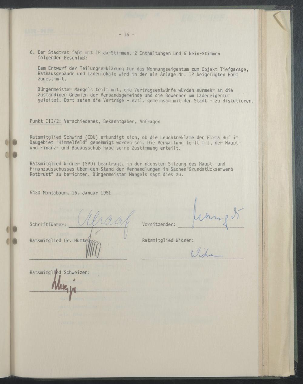 Dem Entwurf der Teilungserklärung für das Wohnungseigentum zum Objekt Tiefgarage, Rathausgebäude und Ladenlokale wird in der als Anlage Nr. 12 beigefügten Form zugestimmt.