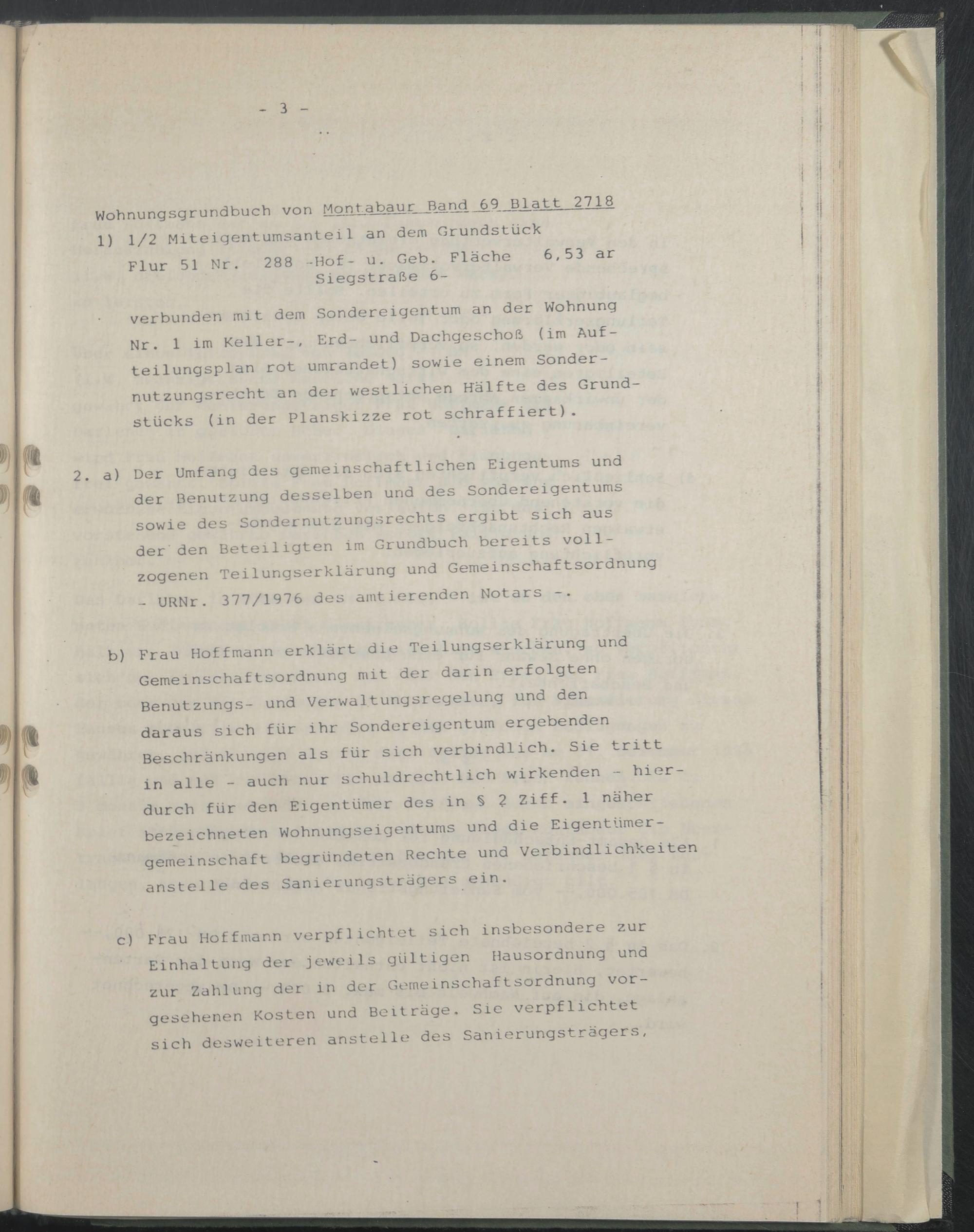 c) Frau Hoffmann verpflichtet sich insbesondere zur Einhaltung der jeweils gültigen Hausordnung und zur Zahlung der in der Gemeinschaftsordnung vorgesehenen Kosten und Beiträge. Sie verpflichtet sich desweiteren anstelle des Sanierungsträgers,