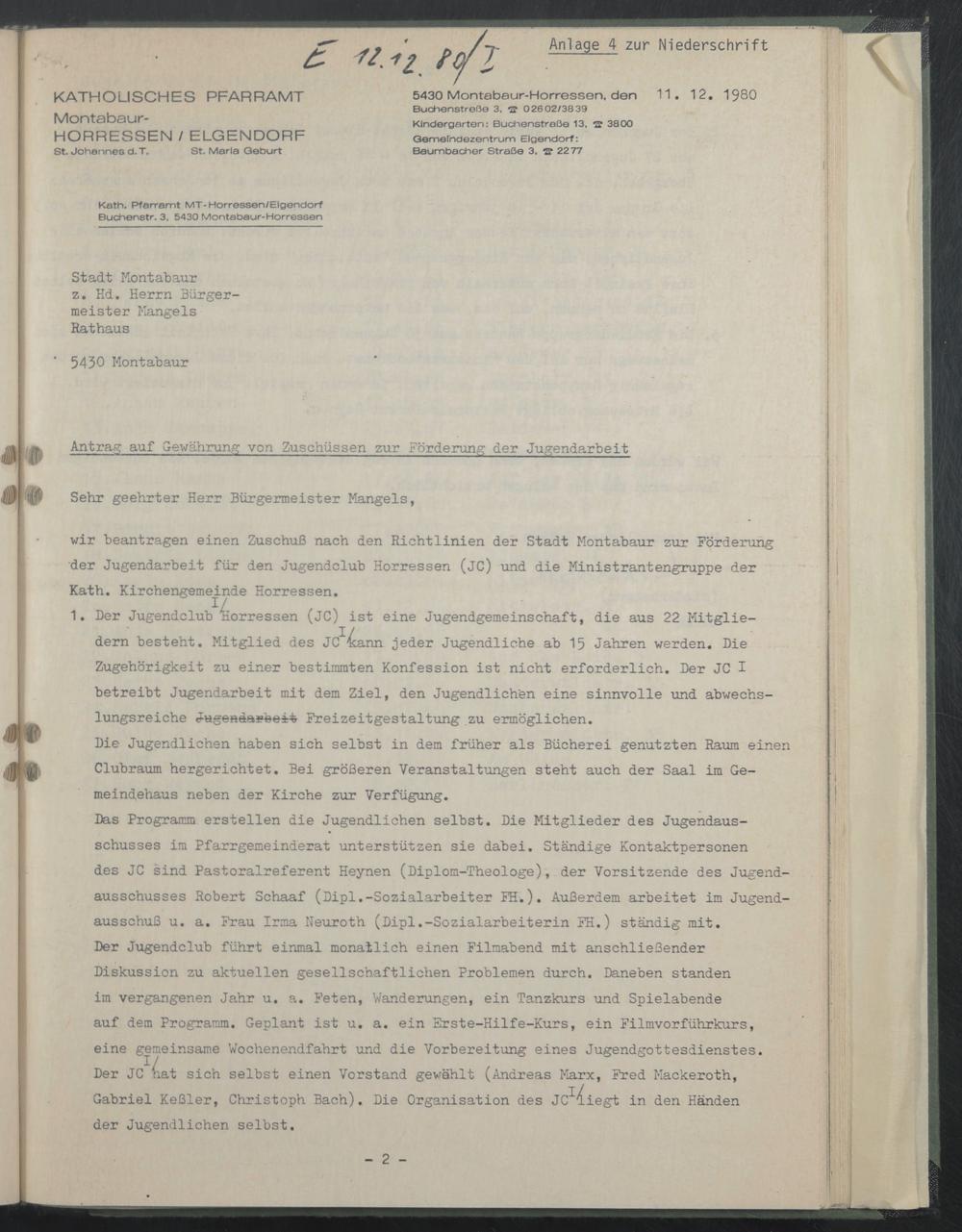 wir beantragen einen Zuschuß nach den Richtlinien der Stadt Montabaur zur Förderung der Jugendarbeit für den Jugendclub Horressen (JC) und die Ministrantengruppe der Kath. Kirchengemeinde Horressen.