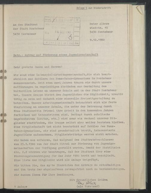Wir haben nun erfahren, daß aufgrund des Stadtratsbeschlusses vom 25.9.1980 von der Stadt Mittel zur Förderung von Jugendgemeinschaften zur Verfügung gestellt werden. Gemäß der Richtlinien Abs. 2.2 möchten wir beantragen, daß der Stadtrat über eine Förderungsberechtigung für das Jahr 1980 berät und beschließt.