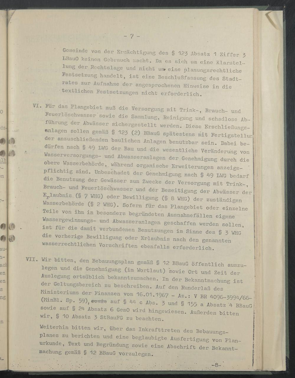 Ministeriums der Finanzen vom 16.01.1967 - Az.: V BR 4096-3994/66-j! (MinBl. Sp. 59 ),< 3 w ?303 auf § 44 c Abs. 3 und § 1ßß a Absatz'4 BBauG!, sowie auf § 24 Absatz 6 GemO wird hingewiesen. Außerdem bitten wir, § 10 Absatz 3 StBauFG zu beachten. ij!