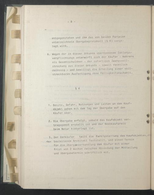 2. Die Übergabe erfolgt, sobald das Kaufobjekt vertragsgemäß erstellt ist und der Restkaufpreis beim Notar hinterlegt ist.