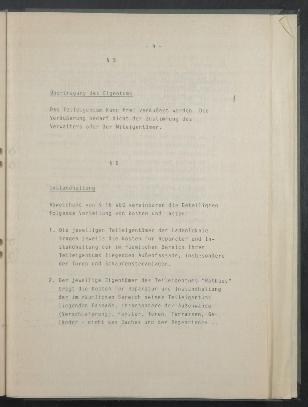 2. Der jeweilige Eigentümer des Teileigentums "Rathaus" trägt die Kosten für Reparatur und Instandhaltung der im räumlichen Bereich seines Teileigentums liegenden Fassade, insbesondere der Außenwände (Verschieferung), Fenster, Türen, Terrassen, Geländer - nicht des Daches und der Regenrinnen -.