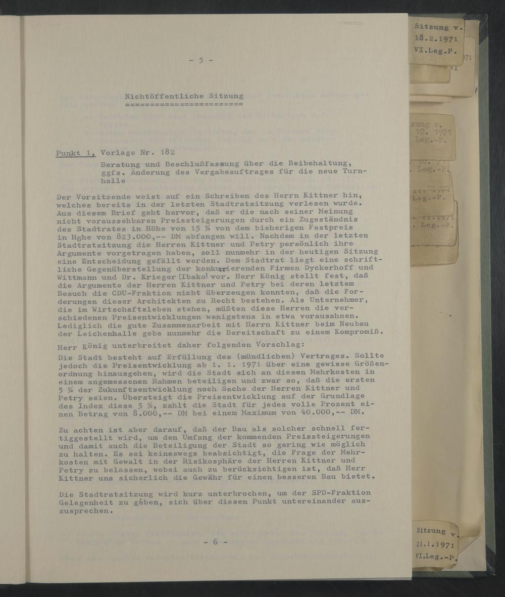 Zu achten ist aber darauf, daß der Bau als solcher schnell fertiggestellt wird, um den Umfang der kommenden Preissteigerungen und damit auch die Beteiligung der Stadt so gering wie möglich zu halten. Es sei keineswegs beabsichtigt, die Frage der Mehrkosten mit Gewalt in der Risikosphäre der Herren Kittner und Petry zu belassen, wobei auch zu berücksichtigen ist, daß Herr Kittner uns sicherlich die Gewähr für einen besseren Bau bietet.
