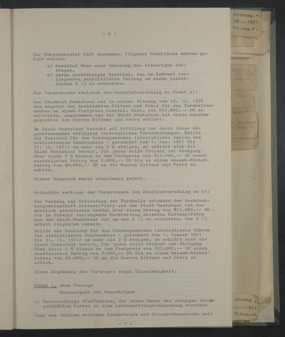 Der Stadtrat Montabaur hat in seiner Sitzung vom lß. 12. 1970 das Angebot der Architekten Kittner und Petry für den Turnhallenneubau zu einem Festpreis einschl. Mwst. von 823.000,-- DM zu errichten, angenommen und die Stadt Montabaur hat diese Annahme gegenüber den Herren Kittner und Petry erklärt.