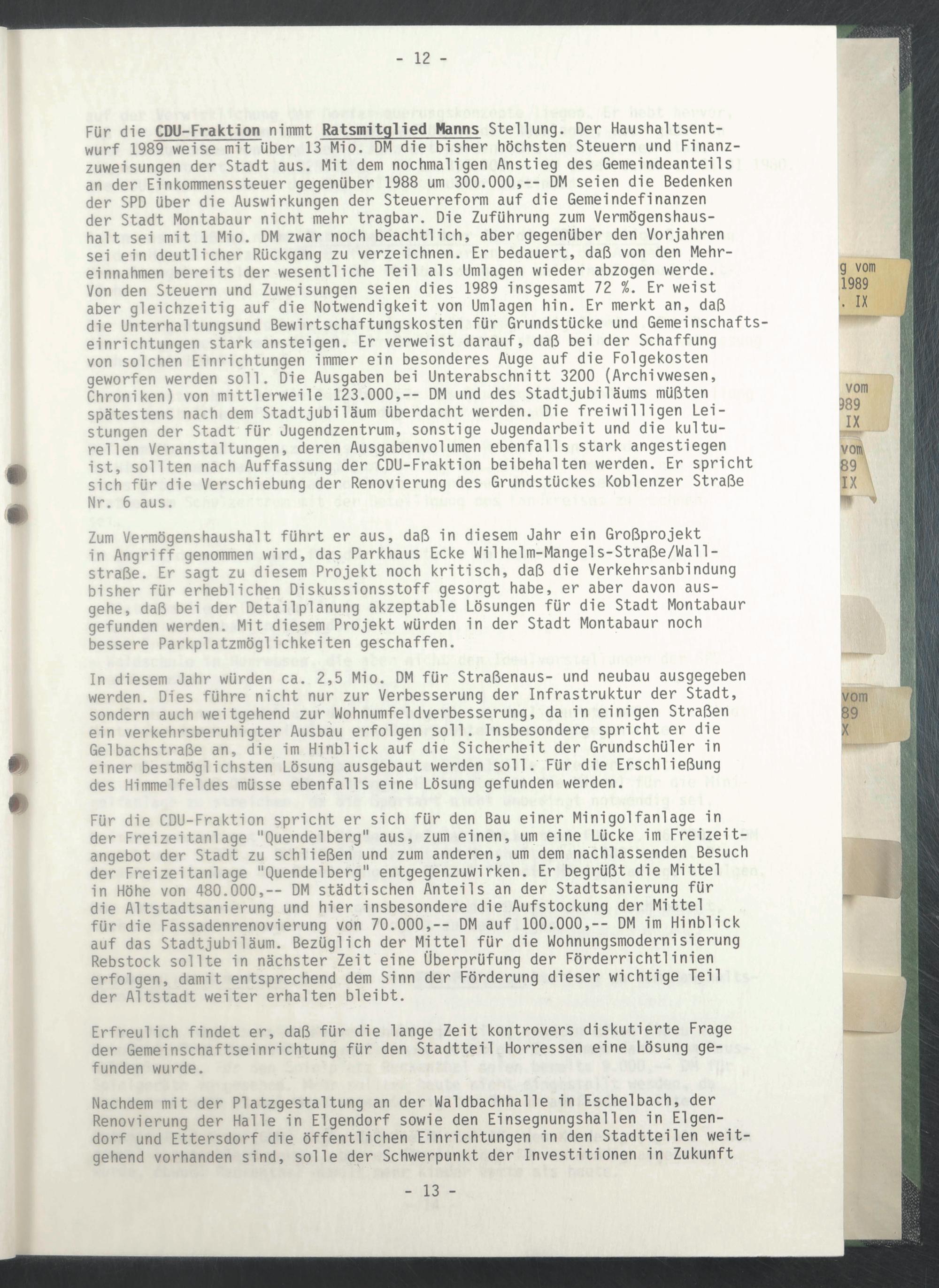 Von den Steuern und Zuweisungen seien dies 1989 insgesamt 72 %. Er weist aber gleichzeitig auf die Notwendigkeit von Umlagen hin. Er merkt an, daß die Unterhaltungsund Bewirtschaftungskosten für Grundstücke und Gemeinschaftseinrichtungen stark ansteigen. Er verweist darauf, daß bei der Schaffung von solchen Einrichtungen immer ein besonderes Auge auf die Folgekosten geworfen werden soll. Die Ausgaben bei Unterabschnitt 3200 (Archivwesen, Chroniken) von mittlerweile 123.000,-- DM und des Stadtjubiläums müßten spätestens nach dem Stadtjubiläum überdacht werden. Die freiwilligen Leistungen der Stadt für Jugendzentrum, sonstige Jugendarbeit und die kulturellen Veranstaltungen, deren Ausgabenvolumen ebenfalls stark angestiegen ist, sollten nach Auffassung der CDU-Fraktion beibehalten werden. Er spricht sich für die Verschiebung der Renovierung des Grundstückes Koblenzer Straße Nr. 6 aus.