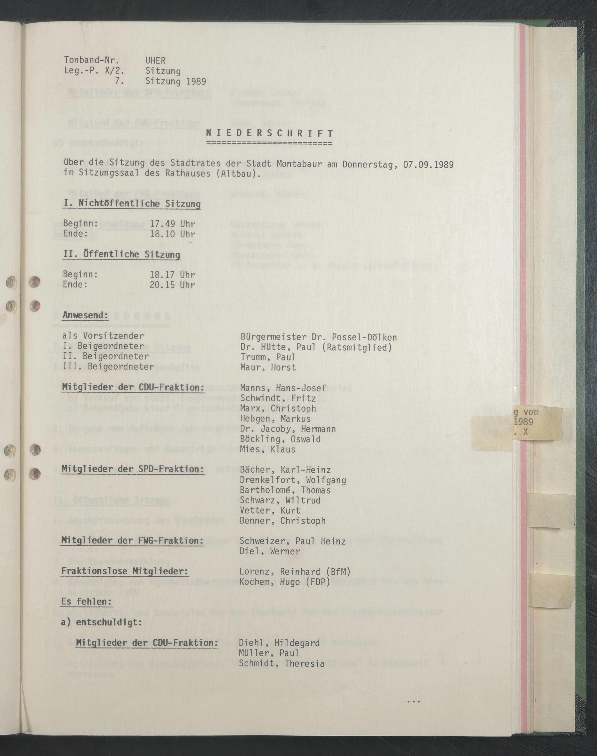 über die Sitzung des Stadtrates der Stadt Montabaur am Donnerstag, 07.09.1989 im Sitzungssaal des Rathauses (Altbau).