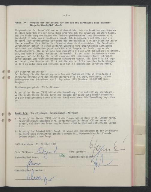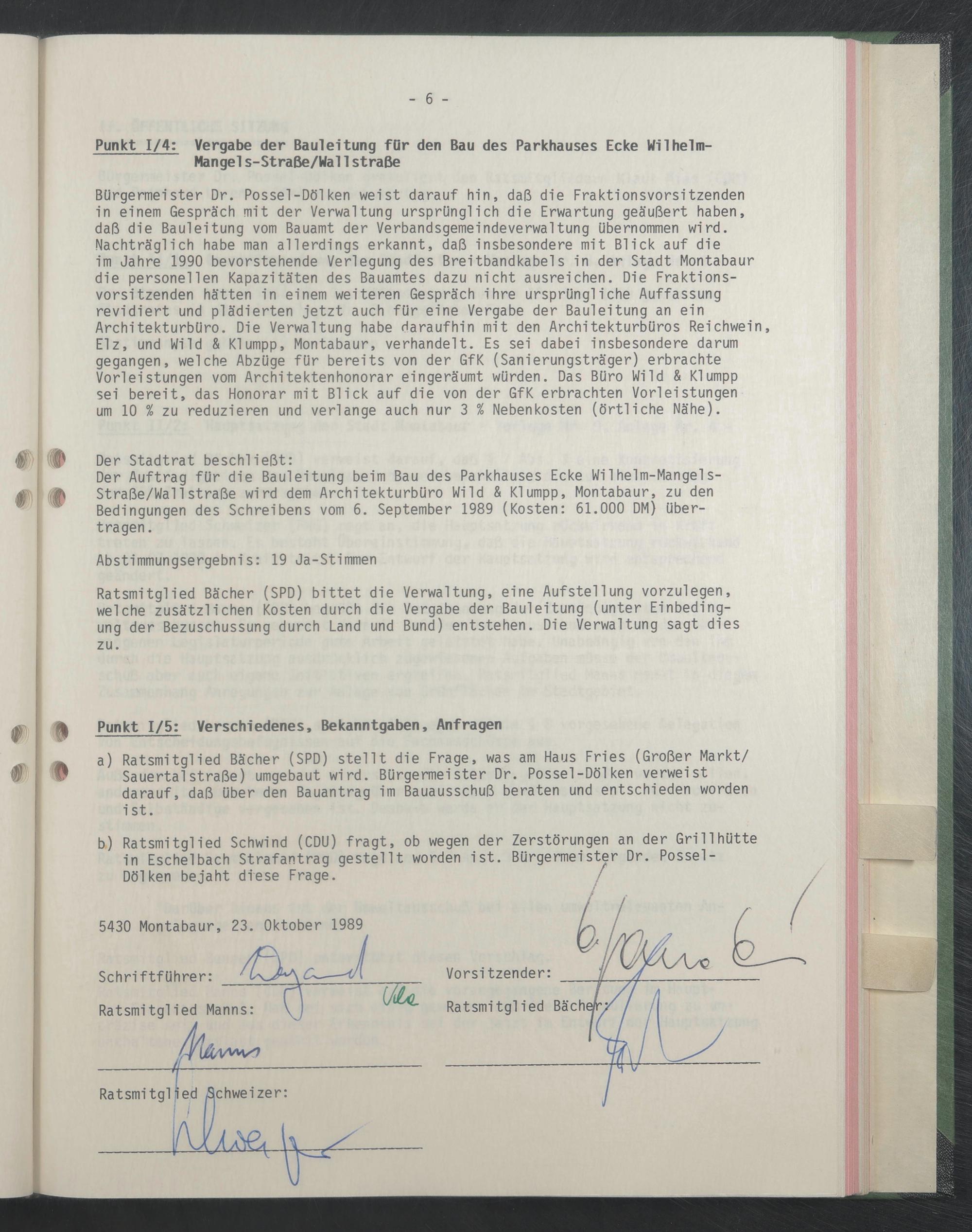 Der Auftrag für die Bauleitung beim Bau des Parkhauses Ecke Wilhelm-Mangels- Straße/WallStraße wird dem Architekturbüro Wild & Klumpp, Montabaur, zu den Bedingungen des Schreibens vom 6. September 1989 (Kosten: 61.000 DM) übertragen.