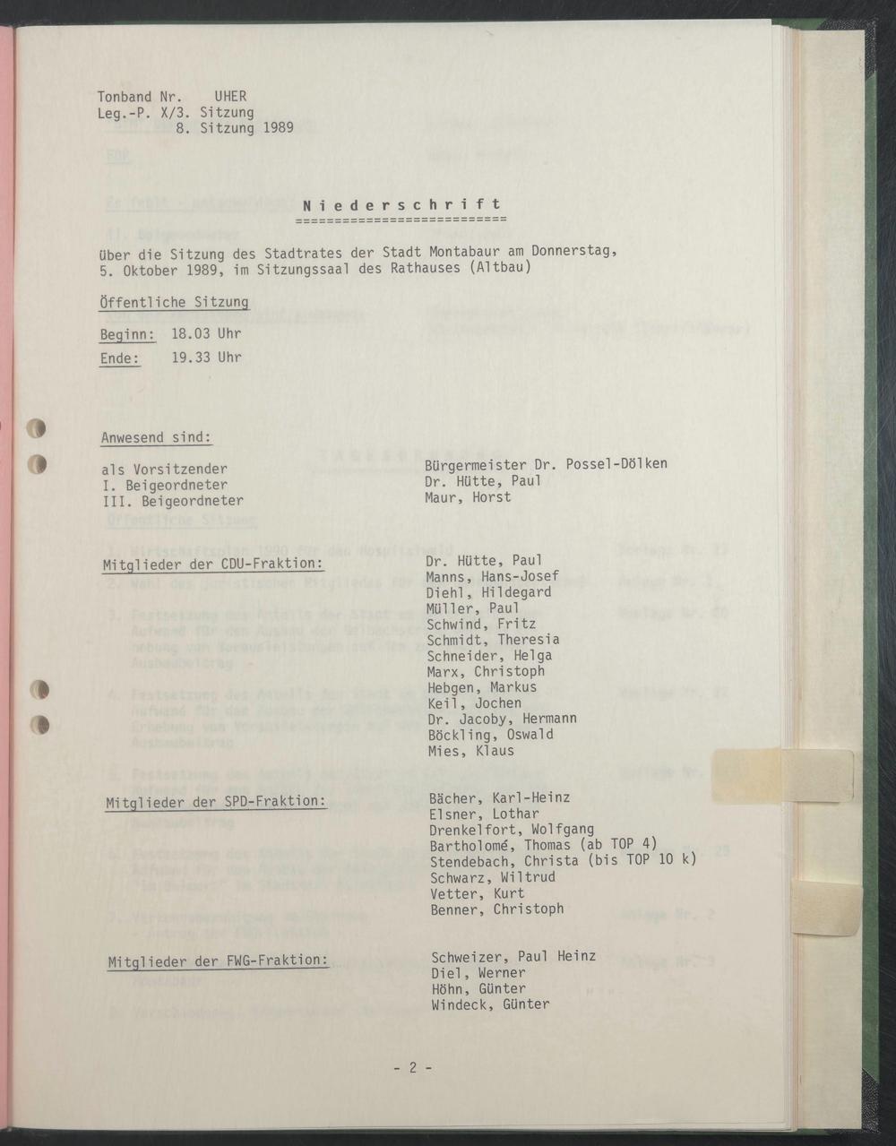 über die Sitzung des Stadtrates der Stadt Montabaur am Donnerstag, 5. Oktober 1989, im Sitzungssaal des Rathauses (Altbau)