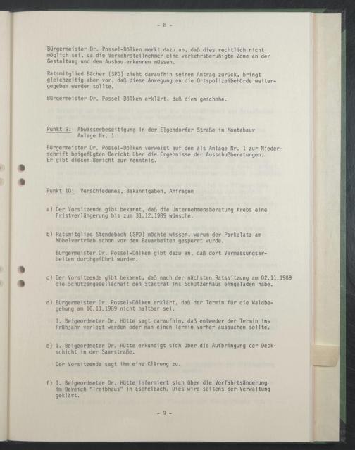 d) Bürgermeister Dr. Possel-Dölken erklärt, daß der Termin für die Waldbegehung am 16.11.1989 nicht haltbar sei.
