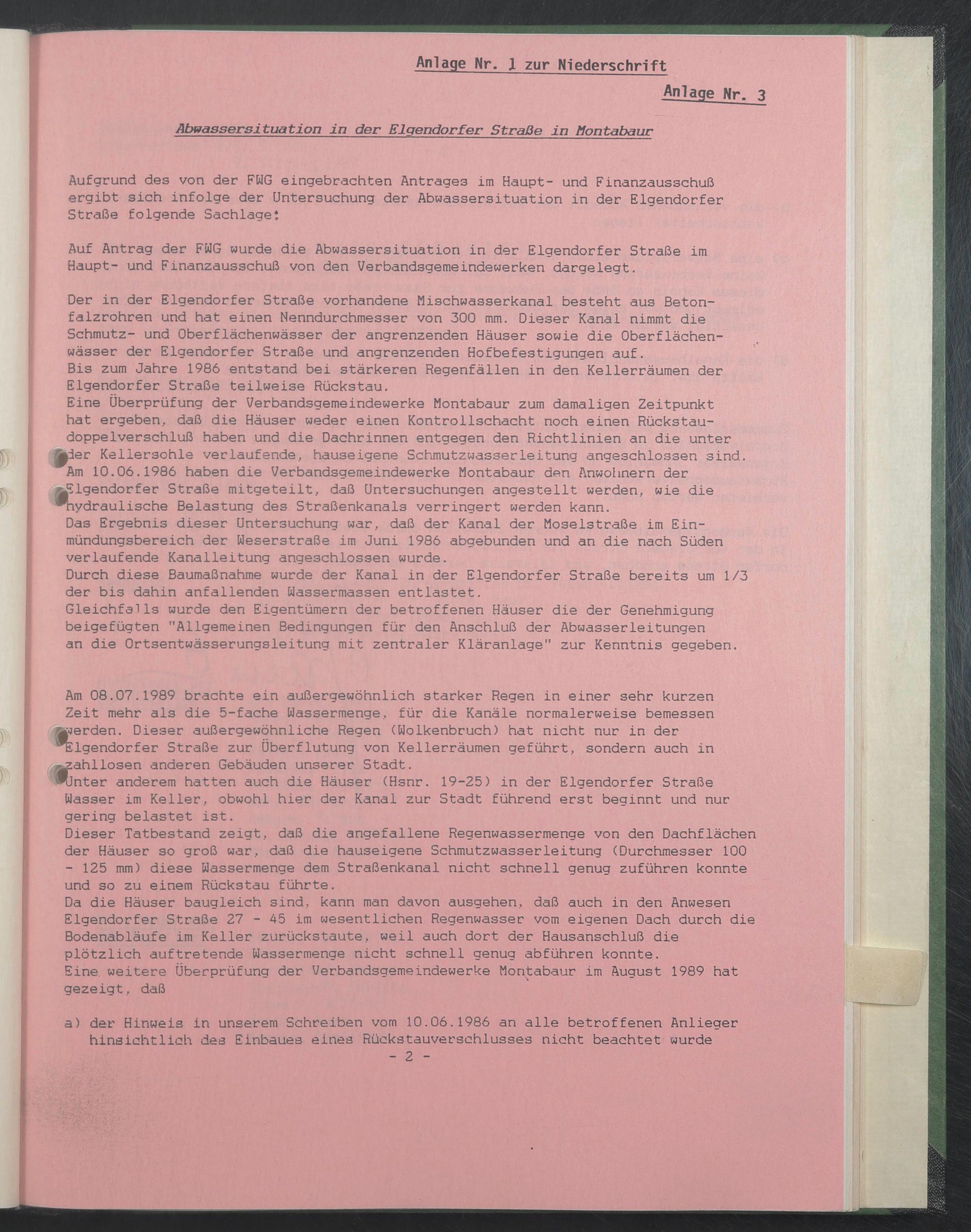 Am 10.06.1986 haben die Verbandsgemeindewerke Montabaur den Anwohnern der ^Elgendorfer Straße mitgeteilt, daß Untersuchungen angestellt werden, wie die ^hydraulische Belastung des Straßenkanals verringert werden kann.