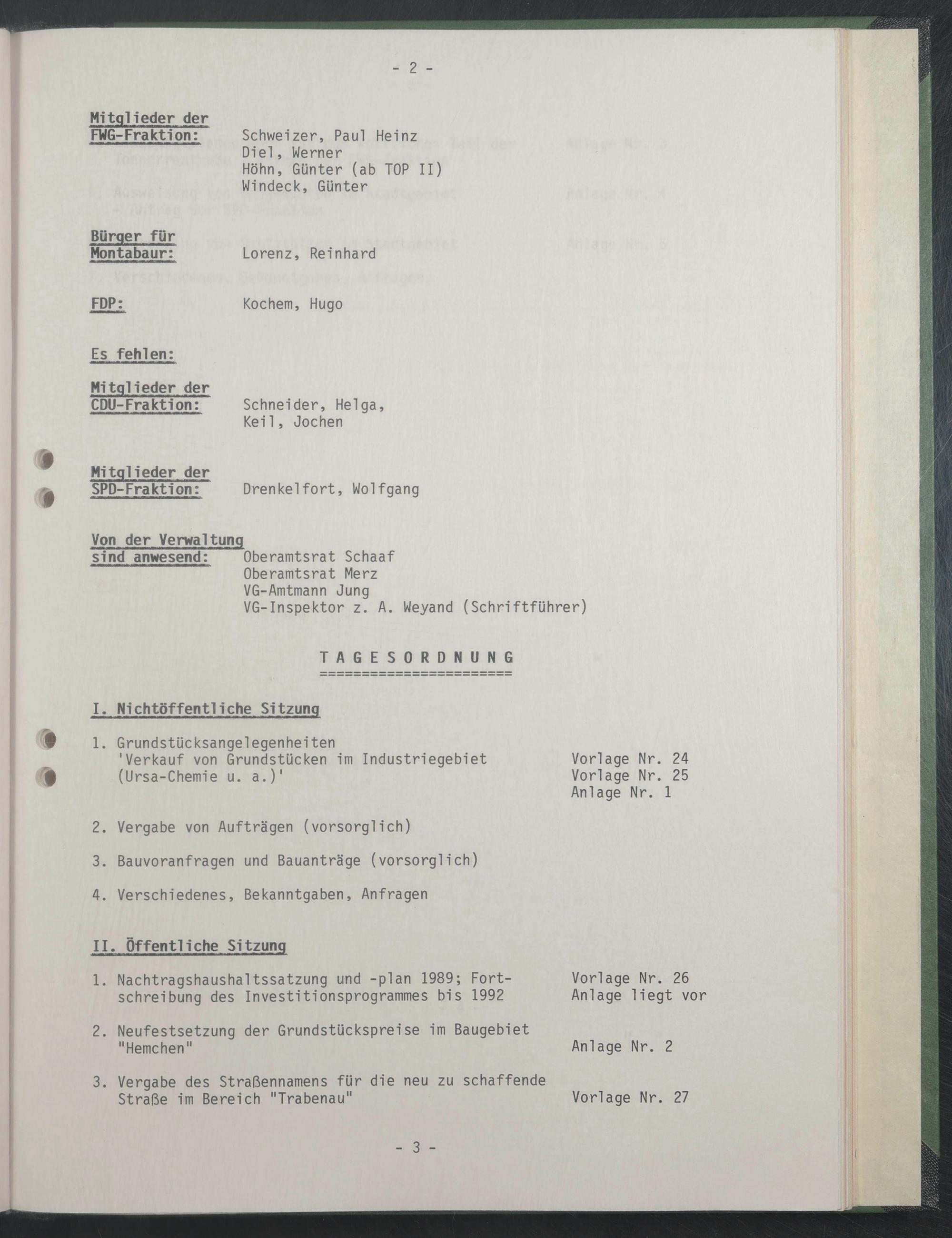 1. Nachtragshaushaltssatzung und -plan 1989; Fort- Vorlage Nr. 26