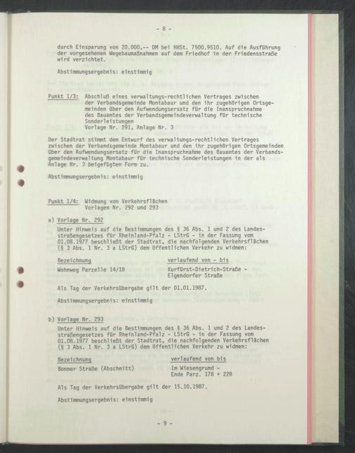 Der Stadtrat stimmt dem Entwurf des verwaltungs-rechtllchen Vertrages zwischen der Verbandsgemeinde Montabaur und den Ihr zugehörigen Ortsgemeinden über den Aufwendungsersatz für die Inanspruchnahme des Bauamtes der Verbandsgemelndeverwaltung Montabaur für technische Sonderlelstungen ln der als Anlage Nr. 3 beigefugten Form zu.