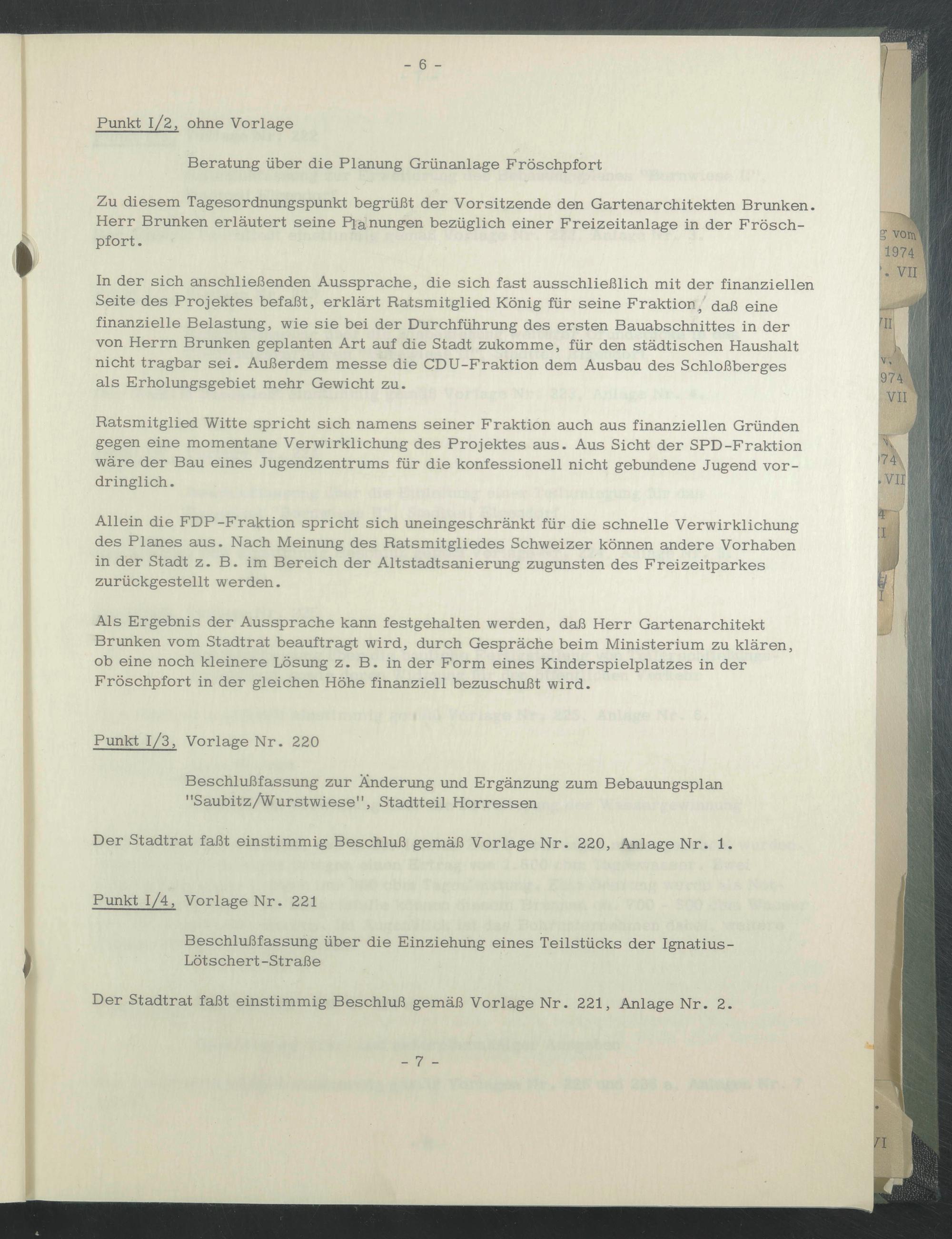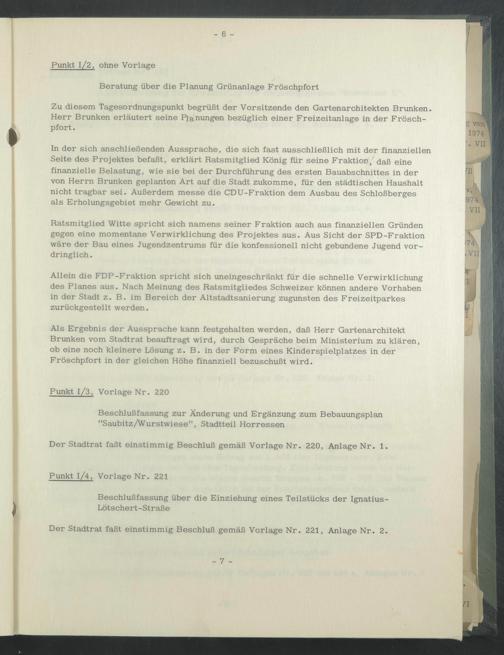 Als Ergebnis der Aussprache kann festgehalten werden, daß Herr Gartenarchitekt Brunken vom Stadtrat beauftragt wird, durch Gespräche beim Ministerium zu klären, ob eine noch kleinere Lösung z. B. in der Form eines Kinderspielplatzes in der Fröschpfort in der gleichen Höhe finanziell bezuschußt wird.