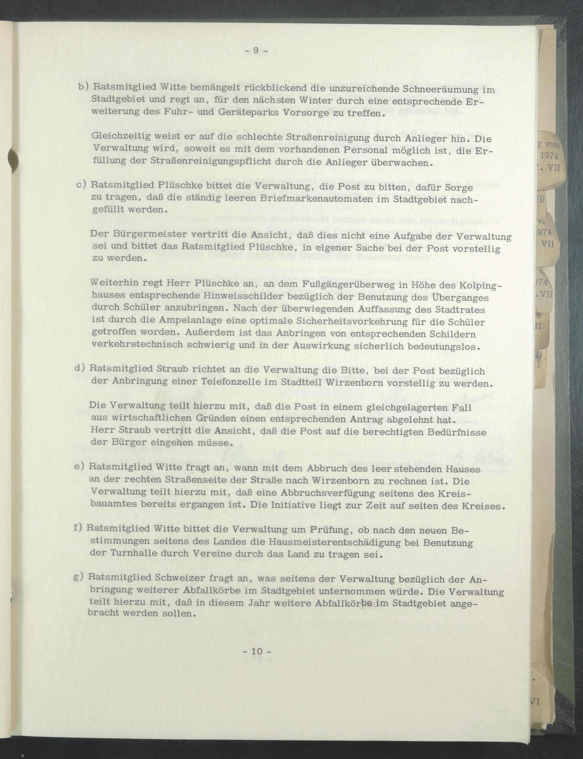 c) Ratsmitglied Plüschke bittet die Verwaltung, die Post zu bitten, dafür Sorge zu tragen, daß die ständig leeren Briefmarkenautomaten im Stadtgebiet nachgefüllt werden.
