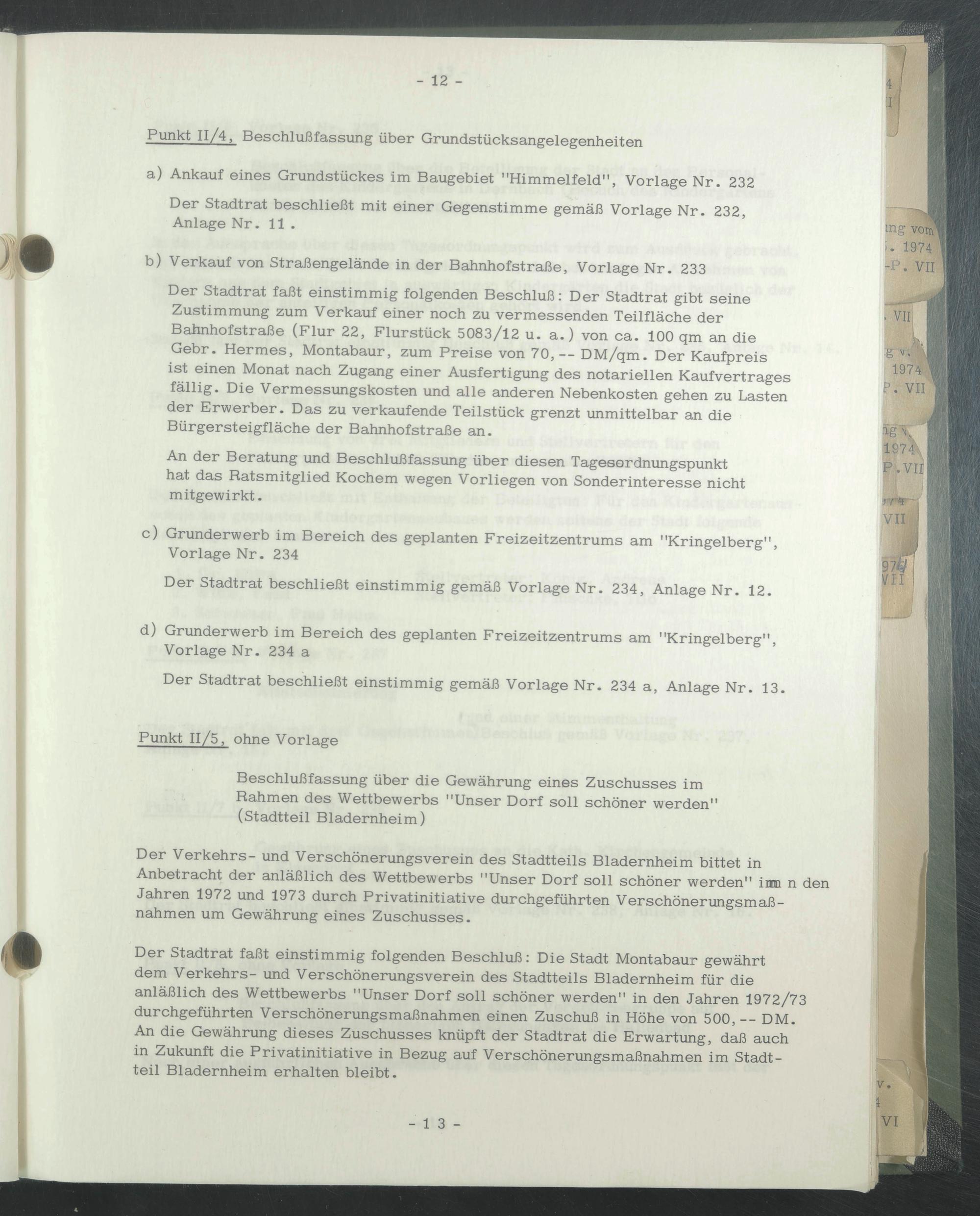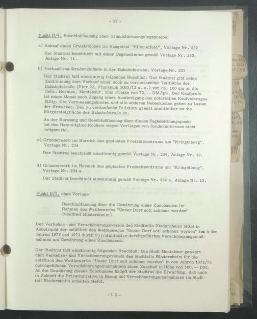 Der Stadtrat faßt einstimmig folgenden Beschluß: Die Stadt Montabaur gewährt dem Verkehrs- und Verschönerungsverein des Stadtteils Bladernheim für die anläßlich des Wettbewerbs "Unser Dorf soll schöner werden" in den Jahren 1972/73 durchgeführten Verschönerungsmaßnahmen einen Zuschuß in Höhe von 500,— DM.