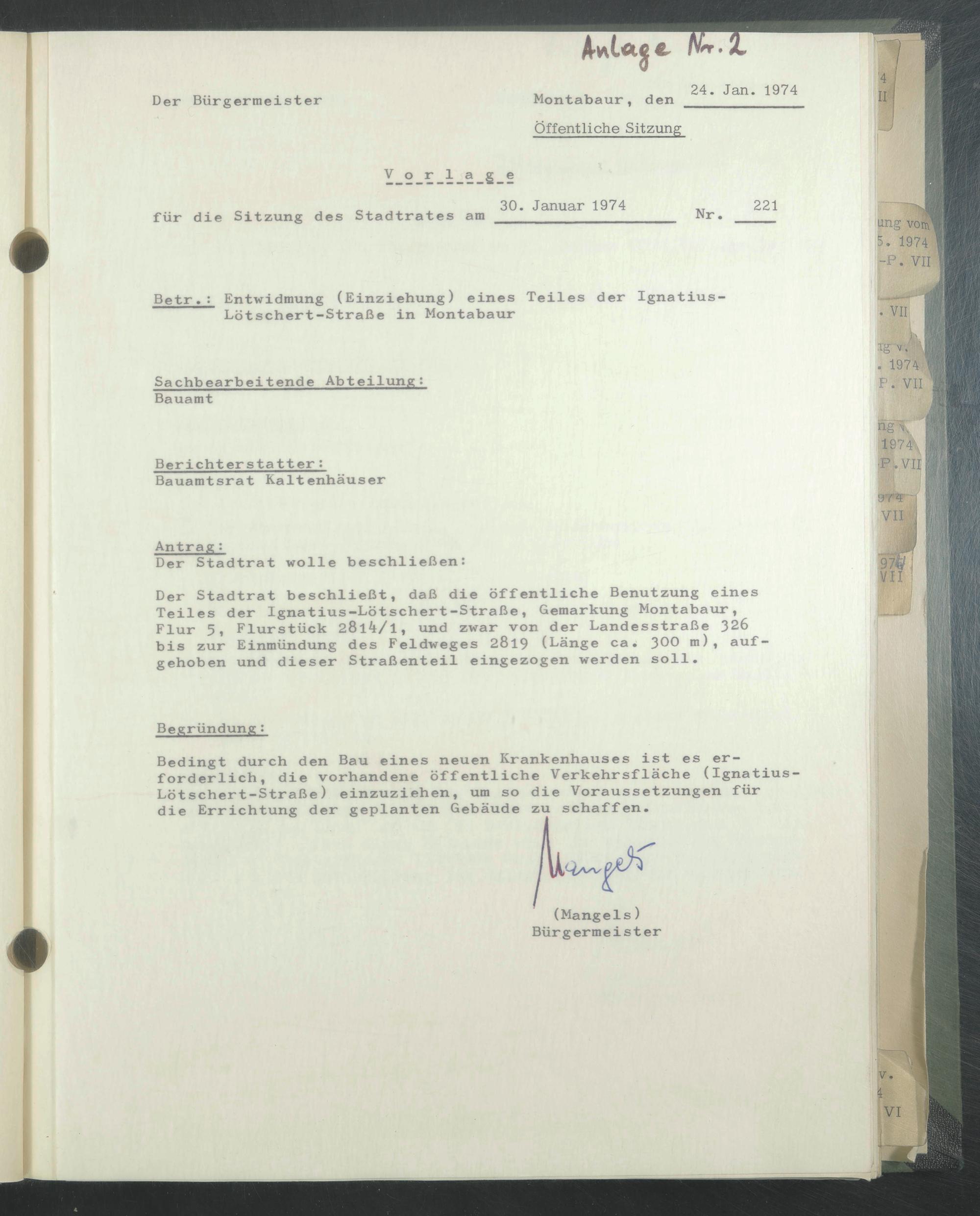 Der Stadtrat beschließt, daß die öffentliche Benutzung eines Teiles der Ignatius-Lötschert-Straße, Gemarkung Montabaur, Flur 5, Flurstück 28l4/l, und zwar von der Landesstraße ß26 bis zur Einmündung des Feldweges 2819 (Länge ca. ßOO m), aufgehoben und dieser Straßenteil eingezogen werden soll.