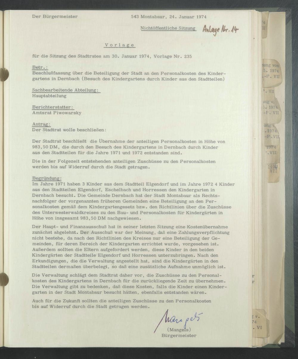 Der Stadtrat beschließt die Übernahme der anteiligen Personalkosten in Höhe von 983,50 DM, die durch den Besuch des Kindergartens in Dernbach durch Kinder aus den Stadtteilen für die Jahre 1971 und 1972 entstanden sind.
