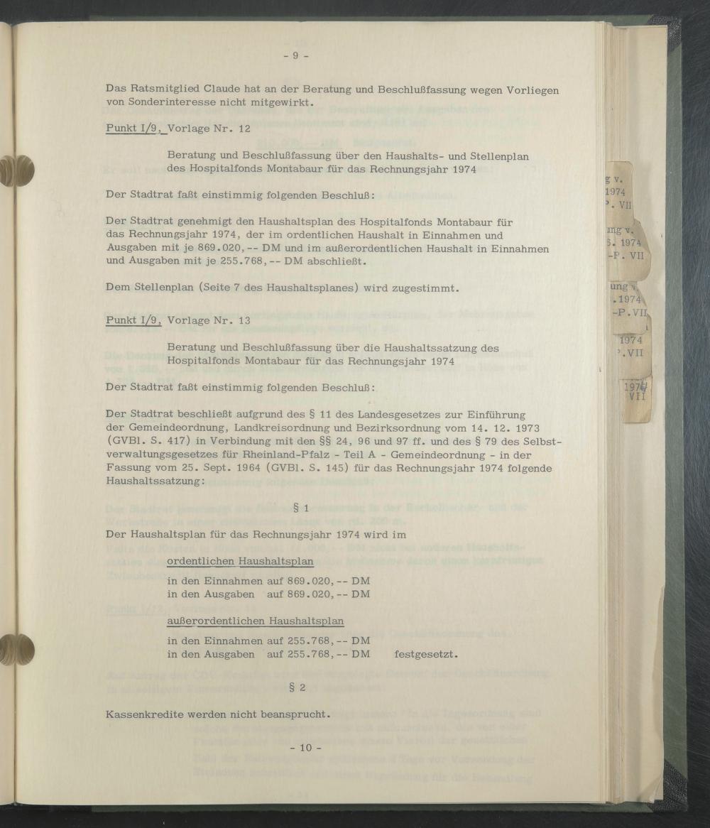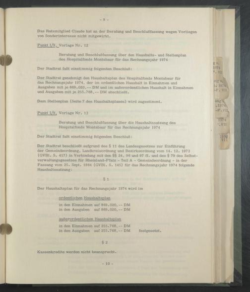 Der Stadtrat genehmigt den Haushaltsplan des Hospitalfonds Montabaur für das Rechnungsjahr 1974, der im ordentlichen Haushalt in Einnahmen und Ausgaben mit je 869.020,-- DM und im außerordentlichen Haushalt in Einnahmen und Ausgaben mit je 255.768, — DM abschließt.