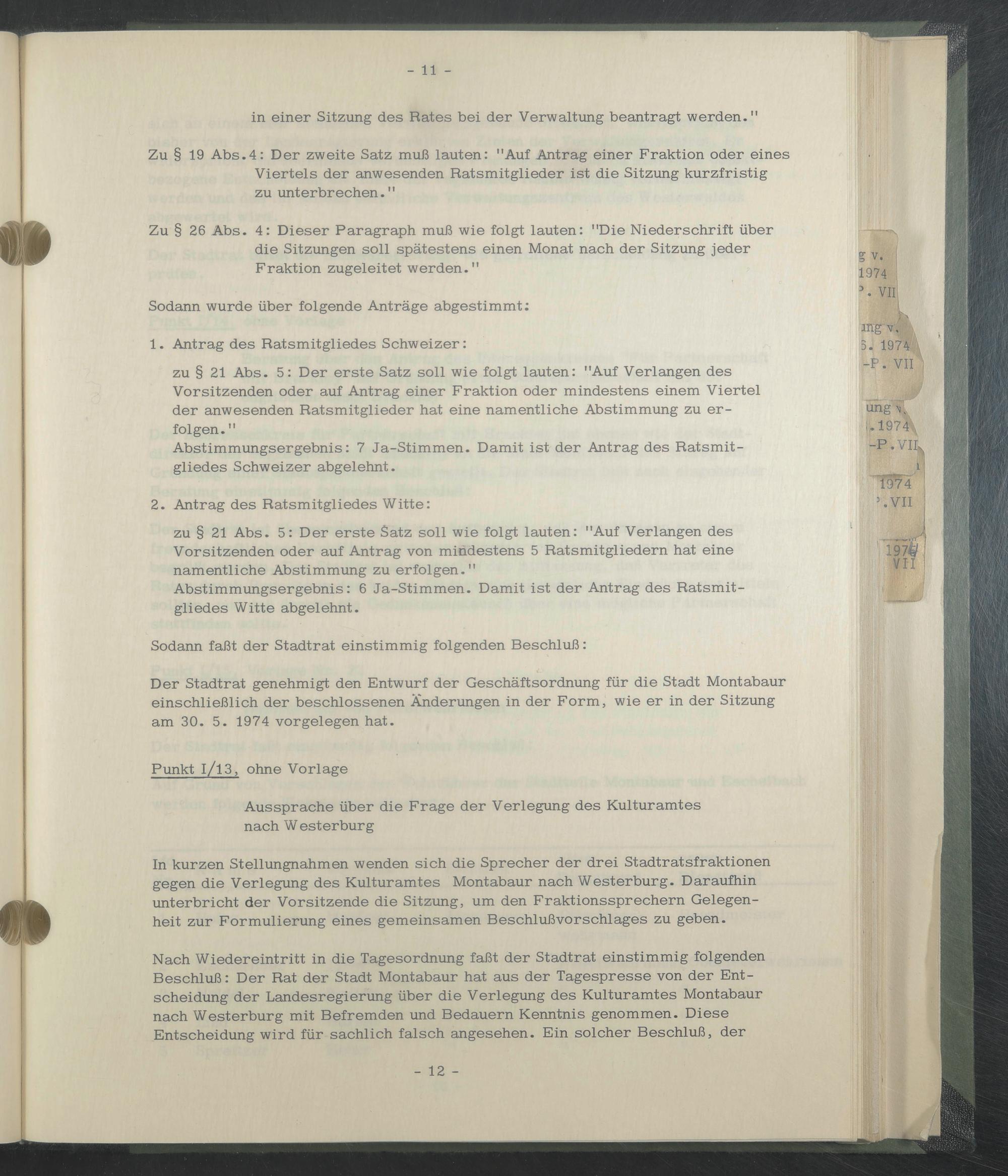 Nach Wiedereintritt in die Tagesordnung faßt der Stadtrat einstimmig folgenden Beschluß: Der Rat der Stadt Montabaur hat aus der Tagespresse von der Entscheidung der Landesregierung über die Verlegung des Kulturamtes Montabaur nach Westerburg mit Befremden und Bedauern Kenntnis genommen. Diese Entscheidung wird für sachlich falsch angesehen. Ein solcher Beschluß, der