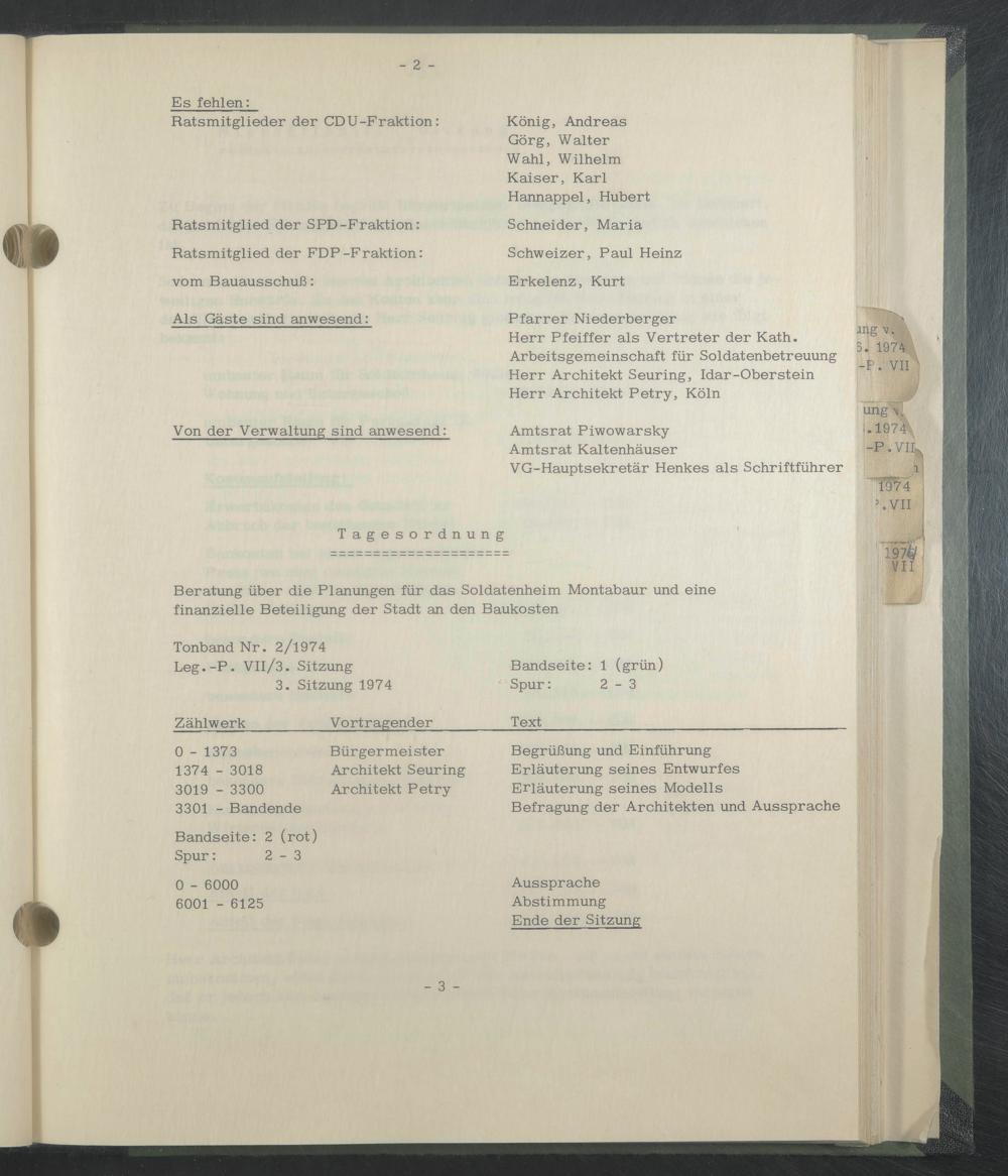 Tonband Nr. 2/1974 Leg.-P. VIl/3. Sitzung