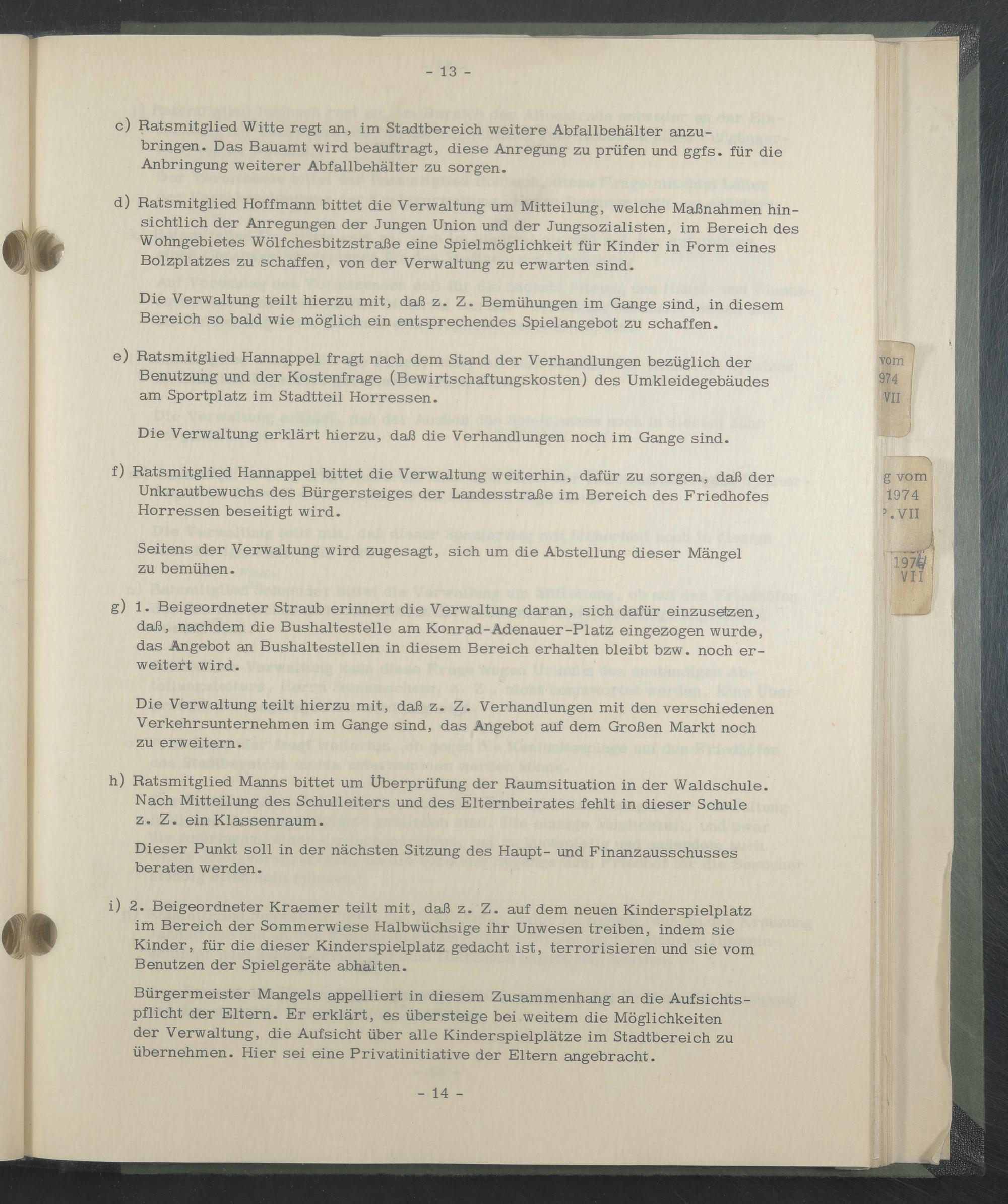 Bürgermeister Mangels appelliert in diesem Zusammenhang an die Aufsichtspflicht der Eltern. Er erklärt, es übersteige bei weitem die Möglichkeiten der Verwaltung, die Aufsicht über alle Kinderspielplätze im Stadtbereich zu übernehmen. Hier sei eine Privatinitiative der Eltern angebracht.