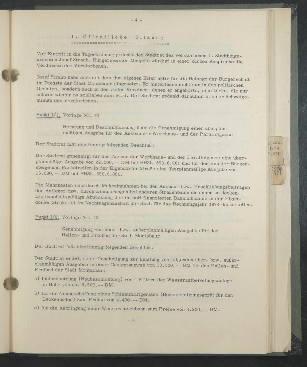 Vor Eintritt in die Tagesordnung gedenkt der Stadtrat des verstorbenen 1. Stadtbeigeordneten Josef Straub. Bürgermeister Mangels würdigt in einer kurzen Ansprache die Verdienste des Verstorbenen.