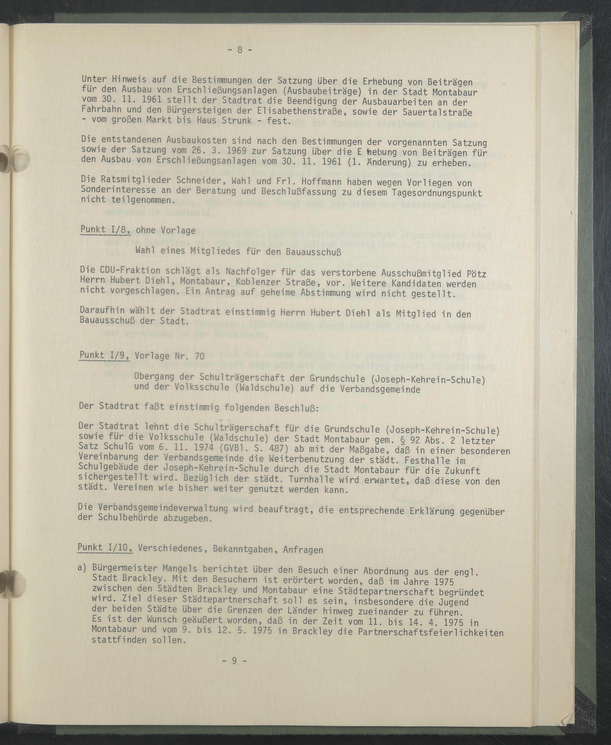 Es ist der Wunsch geäußert worden, daß in der Zeit vom 11. bis 14. 4. 1975 in Montabaur und vom 9. bis 12. 5. 1975 in Brackley die Partnerschaftsfeierlichkeiten stattfinden sollen.