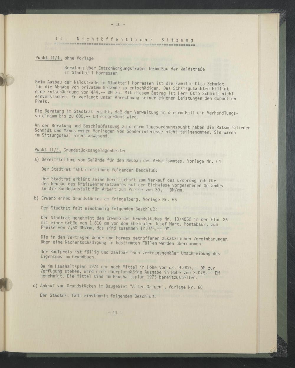 Der Stadtrat genehmigt den Erwerb des Grundstückes Nr. 10/4052 in der Flur 26 mit einer Größe von 1.610 qm von den Eheleuten Josef Marx, Montabaur, zum Preise von 7,50 DM/qm, das sind zusammen 12.075,-- DM.