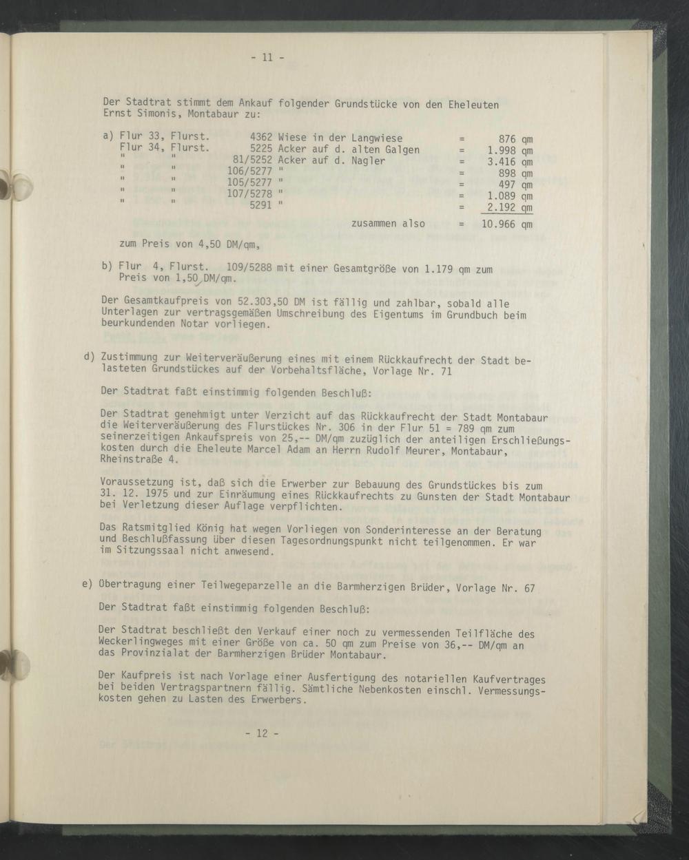 Der Stadtrat stimmt dem Ankauf folgender Grundstücke von den Eheleuten Ernst Simonis, Montabaur zu: