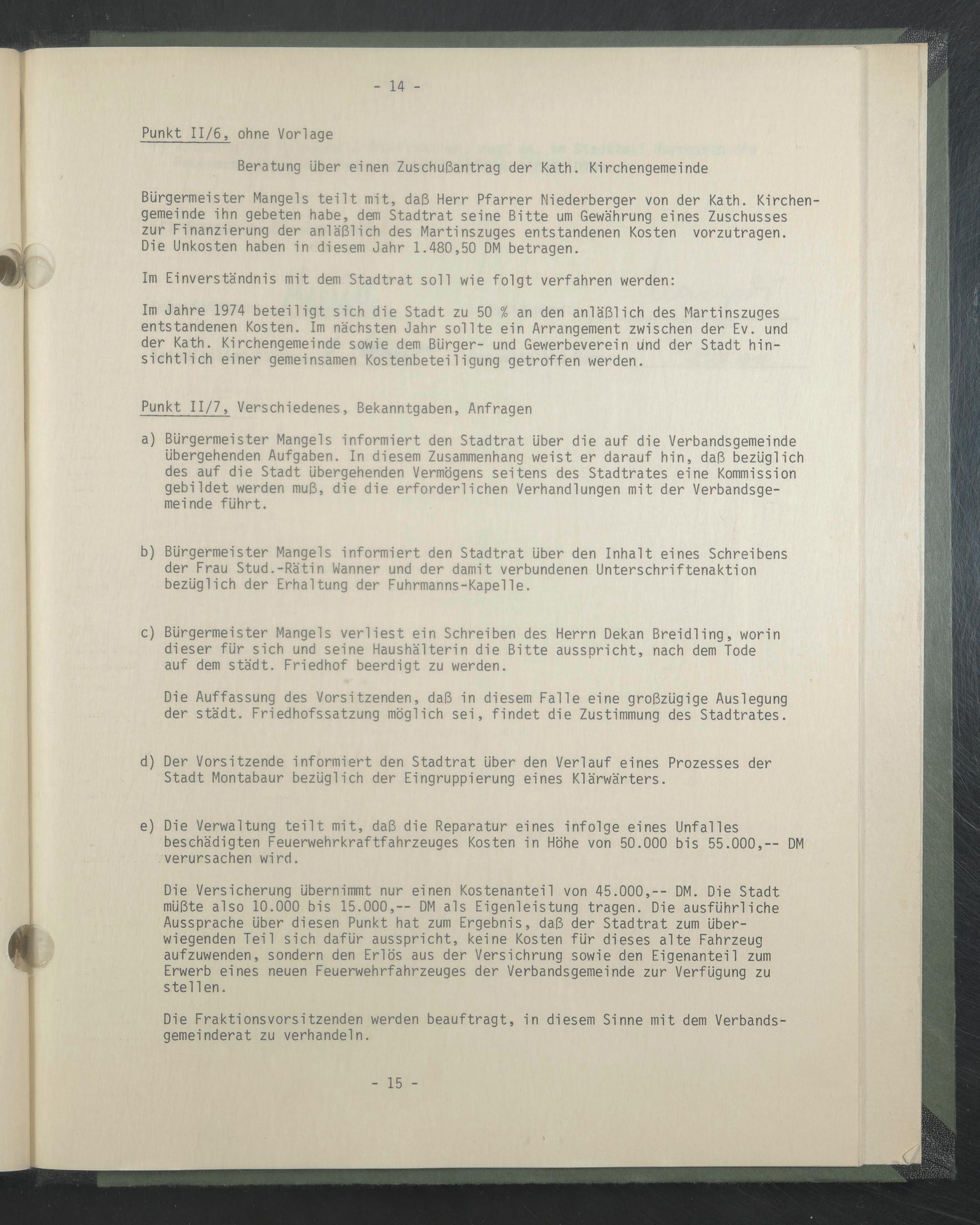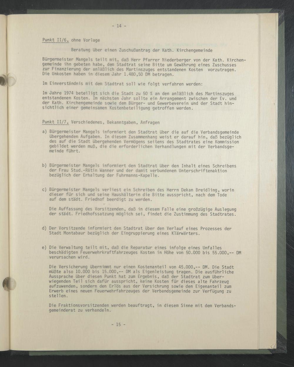 Bürgermeister Mangels teilt mit, daß Herr Pfarrer Niederberger von der Kath. Kirchengemeinde ihn gebeten habe, dem Stadtrat seine Bitte um Gewährung eines Zuschusses zur Finanzierung der anläßlich des Martinszuges entstandenen Kosten vorzutragen.