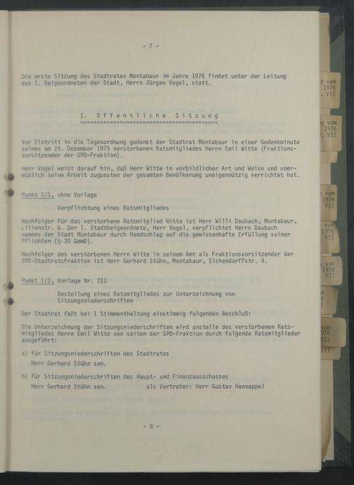 Vor Eintritt in die Tagesordnung gedenkt der Stadtrat Montabaur in einer Gedenkminute seines am 24. Dezember 1975 verstorbenen Ratsmitgliedes Herrn Emil Witte (Fraktionsvorsitzender der SPD-Fraktion).