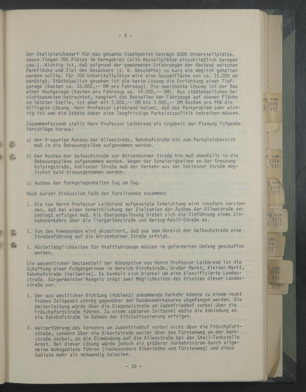 Der Stellplatzbedarf für das gesamte Stadtgebiet beträgt 6000 Unterstellplätze, davon liegen 700 Plätze im Kerngebiet (alle Abstellplätze einschließlich Garagen usw.). Wichtig ist, daß aufgrund der gewonnenen Erfahrungen der Abstand zwischen Parkfläche und Ziel des Besuchers (z. B. Geschäfte) so kurz wie möglich gehalten werden sollte. Für 700 Unterstellplätze wird eine Gesamtfläche von ca. 15.000 qm benötigte Städtebaulich gesehen ist die beste Lösung die Errichtung einer Tiefgarage (Kosten ca. 18.000,-- DM pro Fahrzeug). Die zweitbeste Lösung ist der Bau einer Hochgarage (Kosten pro Fahrzeug ca. 14.000,-- DM). Aus städtebaulichen Gesichtspunkten betrachtet, rangiert das Abstellen der Fahrzeuge auf ebener Fläche an letzter Stelle, ist aber mit 2.000,— DM bis 3.000,— DM Kosten pro PKW die billigste Lösung. Herr Professor Leibbrand betont, daß das Parkproblem sehr wichtig ist und die Städte daher eine langfristige Parkplatzpolitik betreiben müssen.