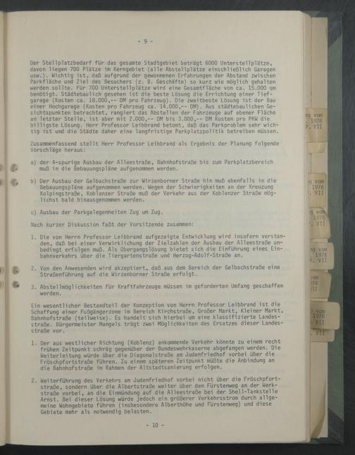 1. Die von Herrn Professor Leibbrand aufgezeigte Entwicklung wird insofern verstanden, daß bei einer Verwirklichung der Zielzahlen der Ausbau der Alleestraße unbedingt erfolgen muß. Als Übergangslösung bietet sich die Einführung eines Einbahnverkehrs über die Tiergartenstraße und Herzog-Adolf-Straße an.