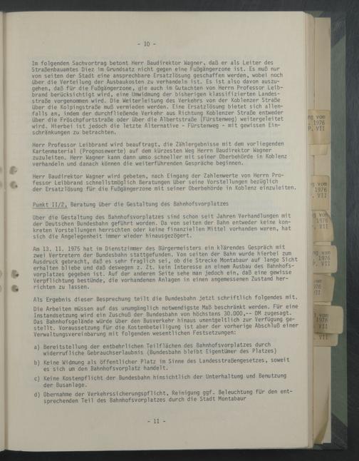 Am 13. 11. 1975 hat im Dienstzimmer des Bürgermeisters ein klärendes Gespräch mit zwei Vertretern der Bundesbahn stattgefunden. Von seiten der Bahn wurde hierbei zum Ausdruck gebracht, daß es sehr fraglich sei, ob die Strecke Montabaur auf lange Sicht erhalten bliebe und daß deswegen z. Zt. kein Interesse an einem Ausbau des Bahnhofsvorplatzes gegeben ist. Auf der anderen Seite sehe man jedoch ein, daß eine gewisse Verpflichtung bestünde, die vorhandenen Anlagen in einen angemessenen Zustand her- richten zu lassen.