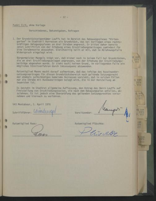 1. Der Grundstückseigentümer Lauffs hat im Bereich des Bebauungsplanes "Hirten- garten" im Stadtteil Horressen ein Grundstück, das bei Vorliegen eines rechtskräftigen Umlegungsplanes an drei Straßen angrenzt. Er bittet daher bereits jetzt schriftlich von der Erhebung eines Erschließungsbeitrages zumindest für eine Straßenseite abzusehen. Gleichzeitig teilt er mit, daß im Ablehnungsfälle Widerspruch eingelegt wird.