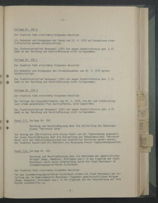 Das Stadtratsmitglied Hannappel (CDU) hat wegen Sonderinteresse gern. § 22 GamO an der Beratung und Beschlußfassung nicht teilgenommen.