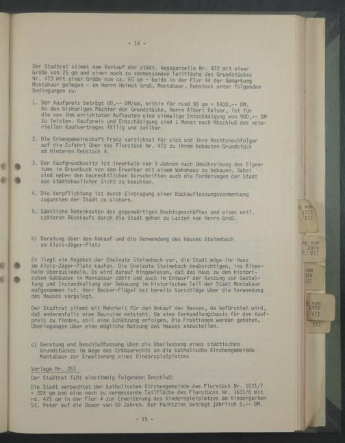 Die Stadt verpachtet der katholischen Kirchengemeinde das Flurstück Nr. 1631/7 = 205 qm und eine noch zu vermessende Teilfläche des Flurstücks Nr. 1631/6 mit rd. 425 qm in der Flur 4 zur Erweiterung des Kinderspielplatzes am Kindergarten St. Peter auf die Dauer von 50 Jahren. Der Pachtzins beträgt jährlich 5,-- DM.