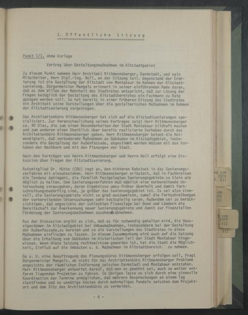 Zu diesem Punkt nehmen Herr Architekt Rittmannsberger, Darmstadt, und sein Mitarbeiter, Herr Dipl.-Ing. Noll, an der Sitzung teil. Gegenstand der Erörterung Ist die Gestaltung der Altstadt von Montabaur Im Rahmen der Altstadt- sanlerung. Bürgermeister Mangels erinnert ln seiner einführenden Rede daran, daß es dem Willen der Mehrheit des Stadtrates entspricht, daß zur Lösung der Fragen bezüglich der Gestaltung des Altstadtberelches ein Fachmann zu Rate gezogen werden soll. So hat bereits ln einer früheren Sitzung des Stadtrates ein Architekt seine Vorstellungen über die gestalterischen Maßnahmen Im Rahmen der Altstadtsanlerung vorgetragen.
