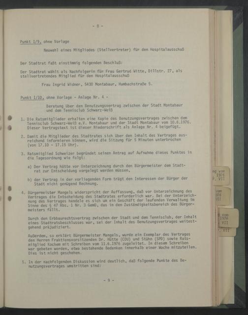 1. Die Ratsmitglieder erhalten eine Kopie des Benutzungsvertrages zwischen dem Tennisclub Schwarz-Weiß e.V. Montabaur und der Stadt Montabaur vom 10.6.1976. Dieser Vertragstext ist dieser Niederschrift als Anlage Nr. 4 beigefügt.