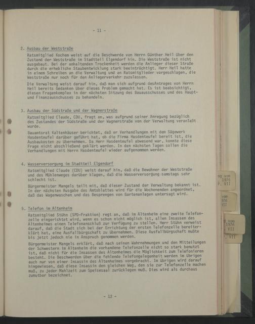 Ratsmitglied Stühn (SPD-Fraktion) regt an, daß im Altenheim eine zweite Telefonzelle eingerichtet wird, wenn es schon nicht möglich ist, allen Insassen des Altenheimes einen Telefonanschluß zur Verfügung zu stellen. Herr Stühn verweist darauf, daß die Stadt sich bei der Errichtung der ersten Telefonzelle bereiterklärt hat, eine Ausfallbürgschaft zu übernehmen. Diese Ausfallbürgschaft mußte bis jetzt jedoch nie in Anspruch genommen werden.