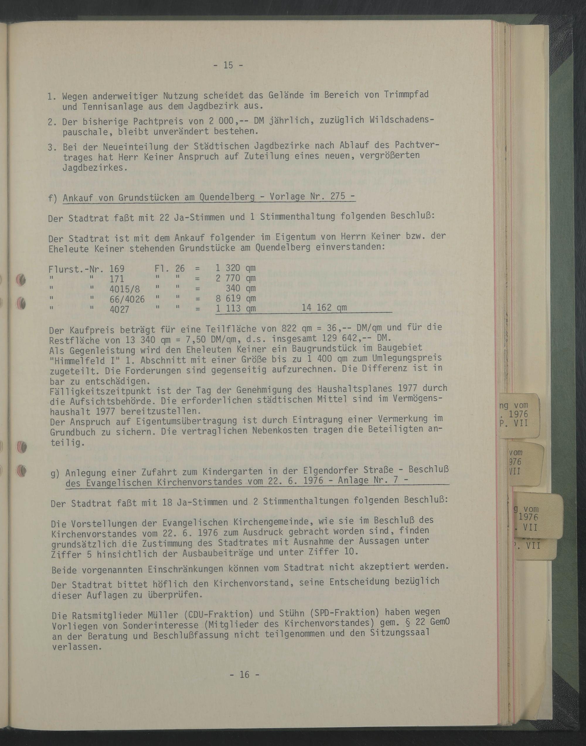 Die Vorstellungen der Evangelischen Kirchengemeinde, wie sie im Beschluß des Kirchenvorstandes vom 22. 6. 1976 zum Ausdruck gebracht worden sind, finden grundsätzlich die Zustimmung des Stadtrates mit Ausnahme der Aussagen unter Ziffer 5 hinsichtlich der Ausbaubeiträge und unter Ziffer 10.