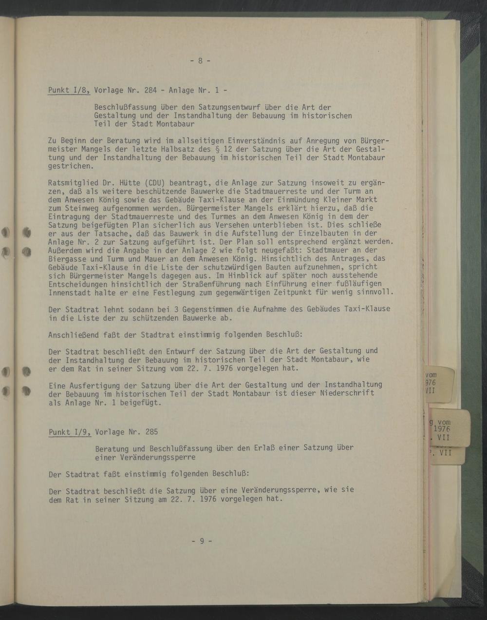 Der Stadtrat beschließt den Entwurf der Satzung über die Art der Gestaltung und der Instandhaltung der Bebauung im historischen Teil der Stadt Montabaur, wie er dem Rat in seiner Sitzung vom 22. 7. 1976 Vorgelegen hat.