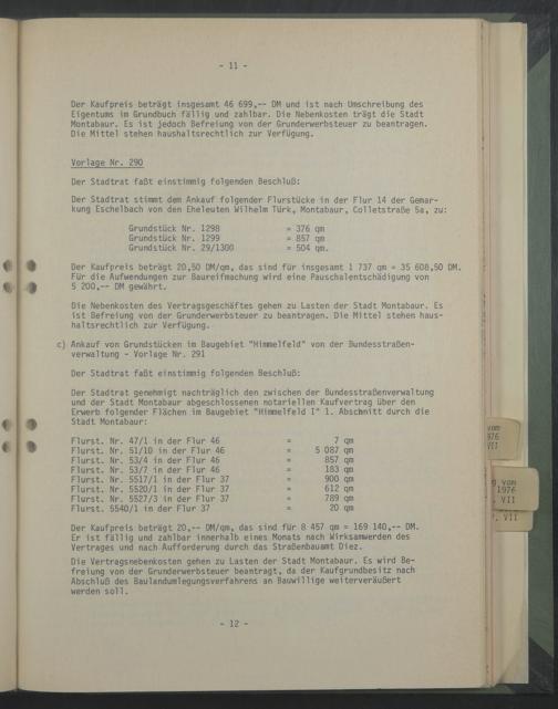 Die Vertragsnebenkosten gehen zu Lasten der Stadt Montabaur. Es wird Befreiung von der Grunderwerbsteuer beantragt, da der Kaufgrundbesitz nach Abschluß des Baulandumlegungsverfahrens an Bauwllllge weiterveräußert werden soll.