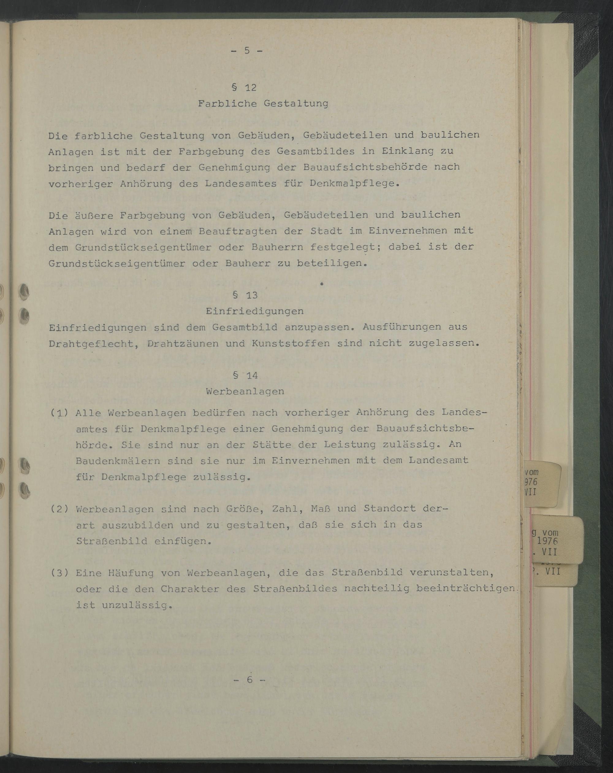 Die farbliche Gestaltung von Gebäuden, Gebäudeteilen und baulichen Anlagen ist mit der Farbgebung des Gesamtbildes in Einklang zu bringen und bedarf der Genehmigung der Bauaufsichtsbehörde nach vorheriger Anhörung des Landesamtes für Denkmalpflege.