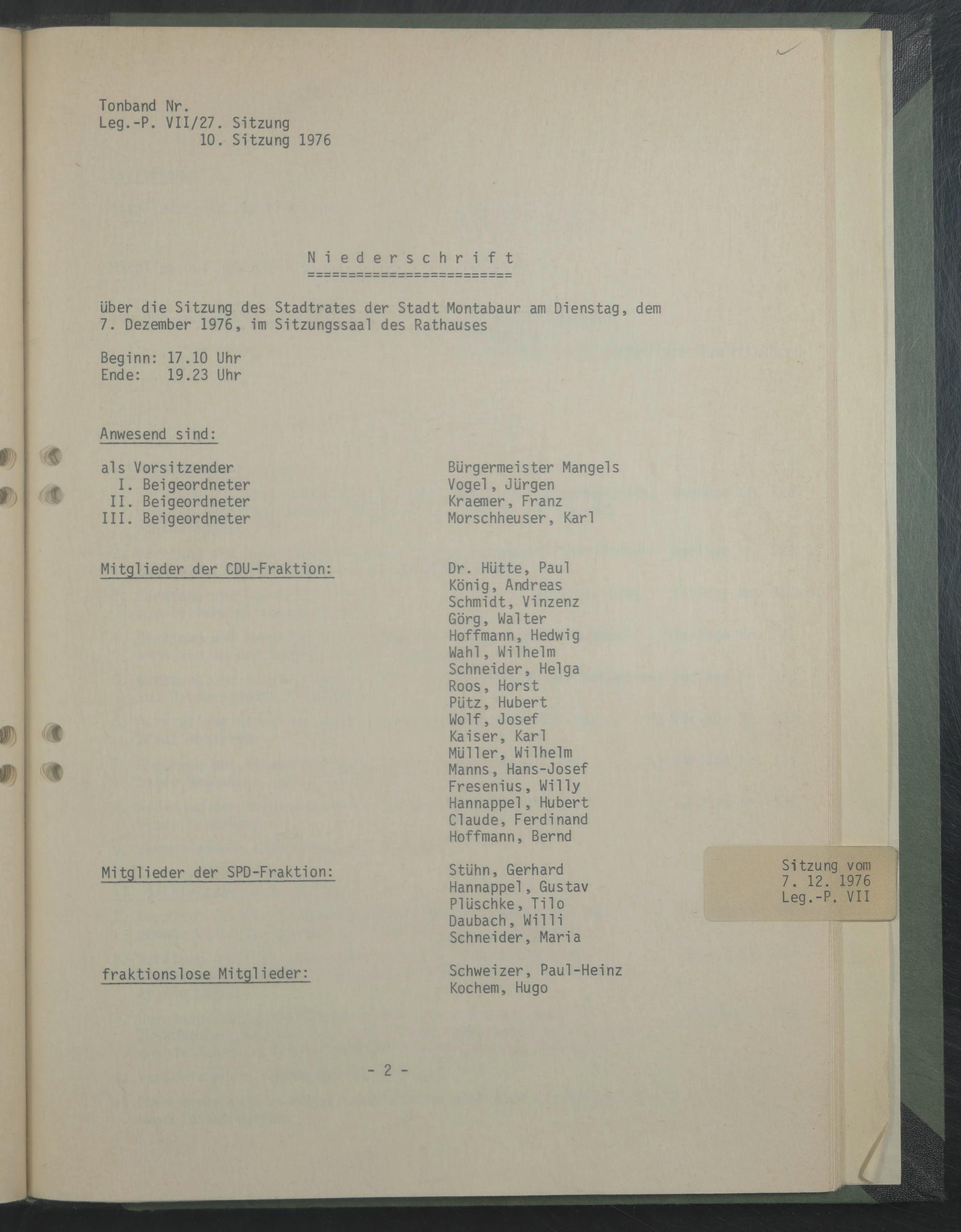 über die Sitzung des Stadtrates der Stadt Montabaur am Dienstag, dem 7. Dezember 1976, im Sitzungssaal des Rathauses